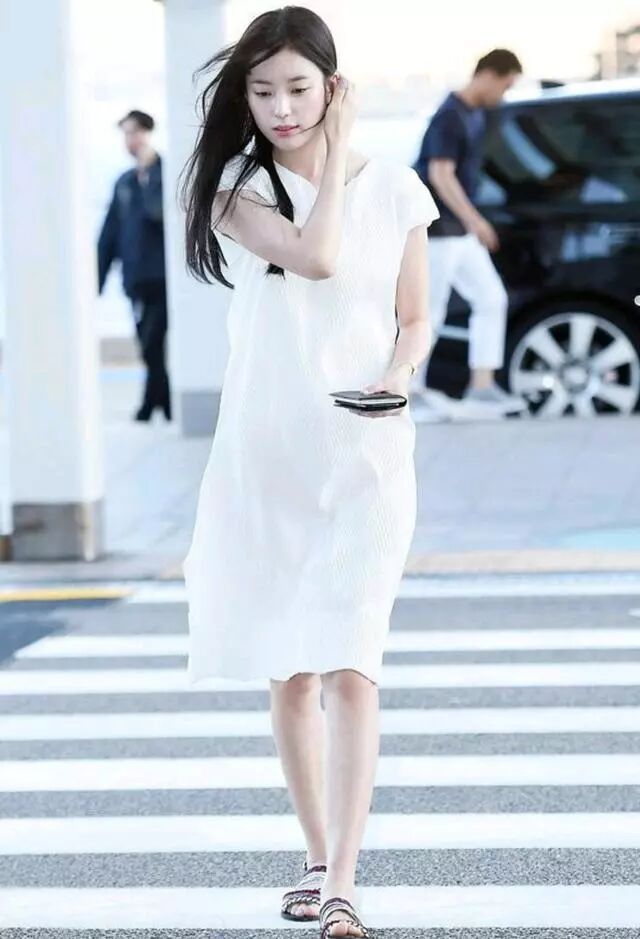 韓孝周身穿一條白色連衣裙,搭配上一雙民族風的涼鞋,青青爽爽,美的很舒服