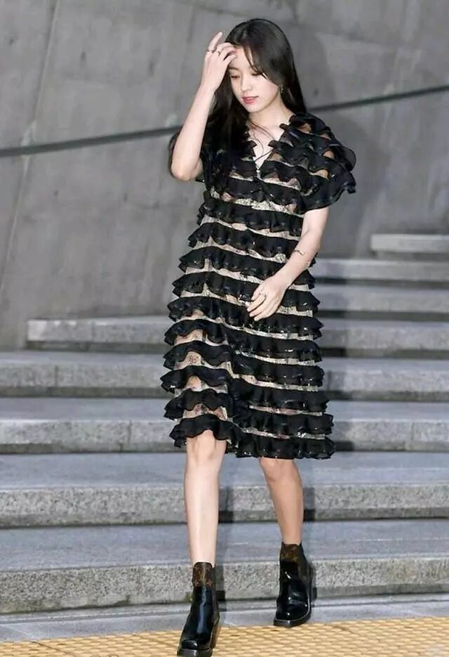 而韓孝周身穿連衣裙的獨特設計,復古印花網紗打底加上層層的木耳邊造型讓上衣更加有層次感,穿起來更時尚。視覺上若隱若現性感十足。腳上搭配了一雙黑色小短靴,簡約幹練。