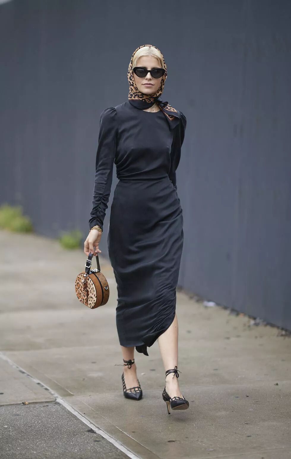 絲巾連衣裙呢,看上去很難駕馭,又挑人,但其實搭起來也有訣竅,把絲巾飄忽忽的感覺壓住是關鍵。