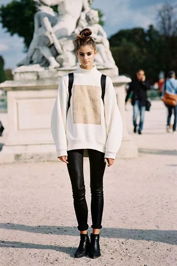 長到大腿根的衛衣簡直就是秀美腿利器呀,下半身失蹤只為讓我的腿再長個三公分,再搭配oversize的寬鬆效果與超長袖口的設計,身上的贅肉和手臂上的拜拜肉全部隱形,不愧是這群時髦精們街拍的屏霸單品呀!