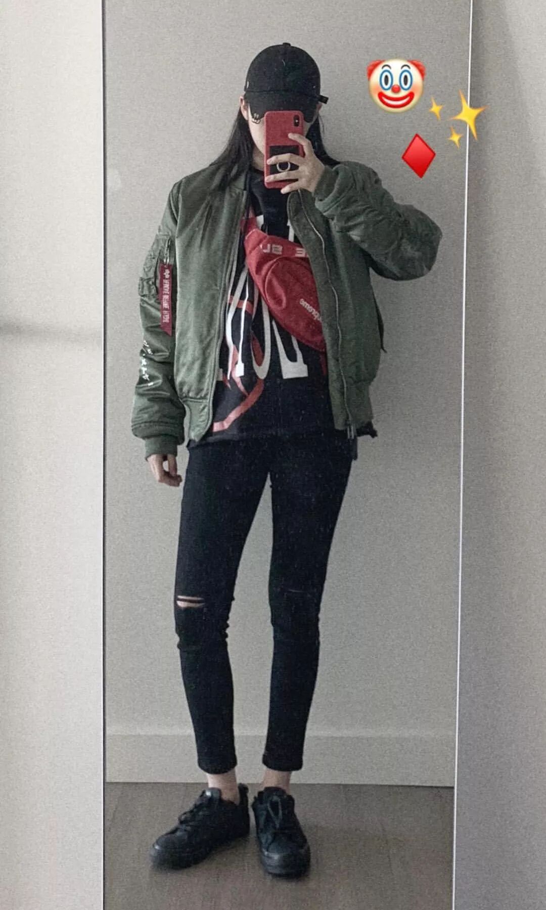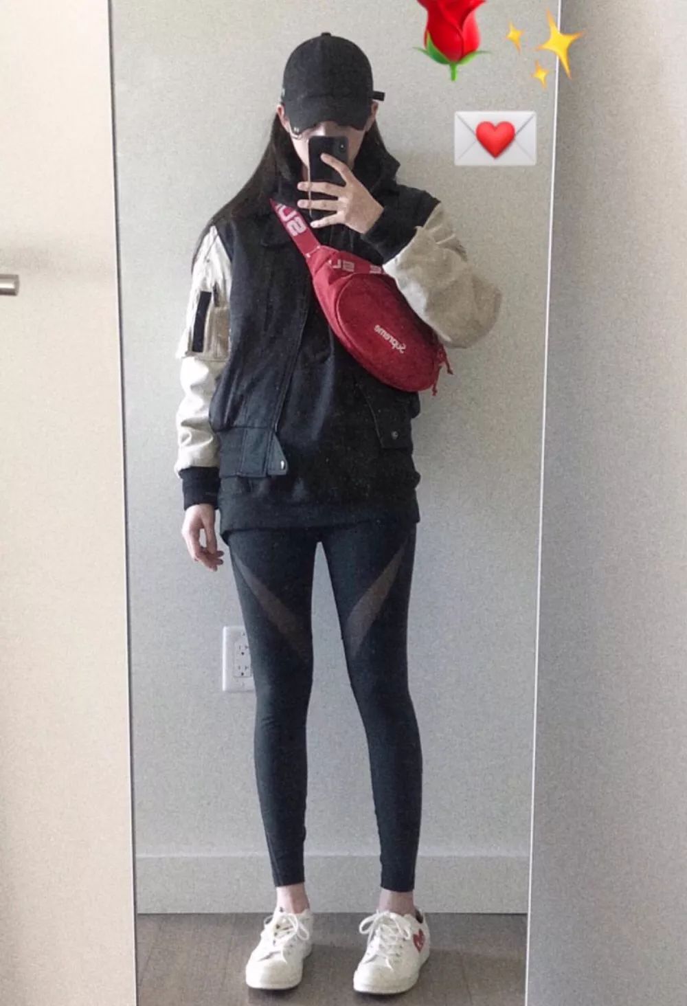 棒球夾克也是秋季必不可少的單品之一,歐陽娜娜搭配了紅色的Supreme腰包,今天依舊是帥氣的利落少女。