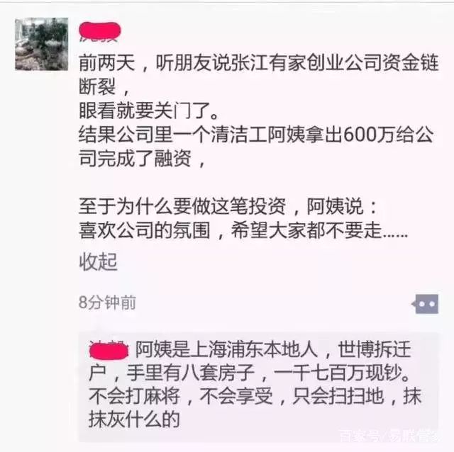 這時公司里一個清潔工阿姨挺身而出,拿了600萬給公司完成了融資。