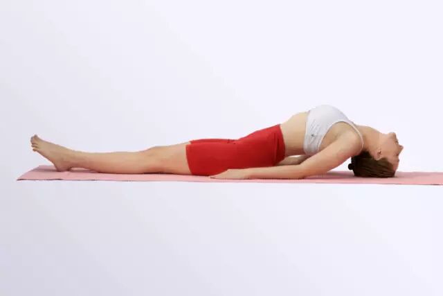 a 平躺在瑜伽墊上,膝蓋繃緊。