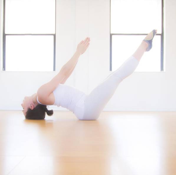 c 呼氣,向上抬腿與地面呈45度角,雙臂抬起,雙掌相合,盡量讓雙臂與雙腿保持平行。肋骨完全伸展,保持這個體式30秒,自然呼吸。呼氣,放下雙腿、雙臂回到瑜伽墊上,平躺放鬆。