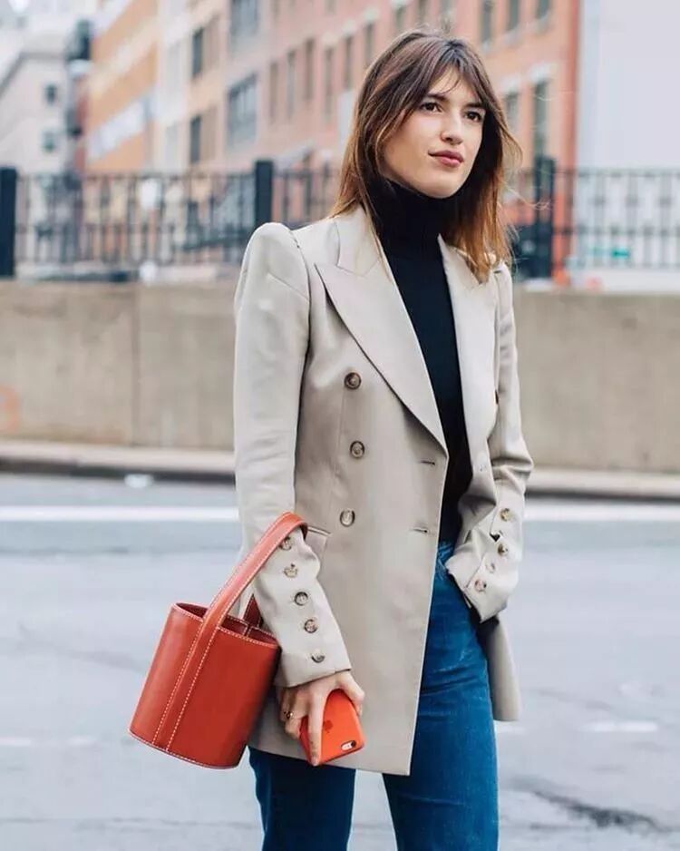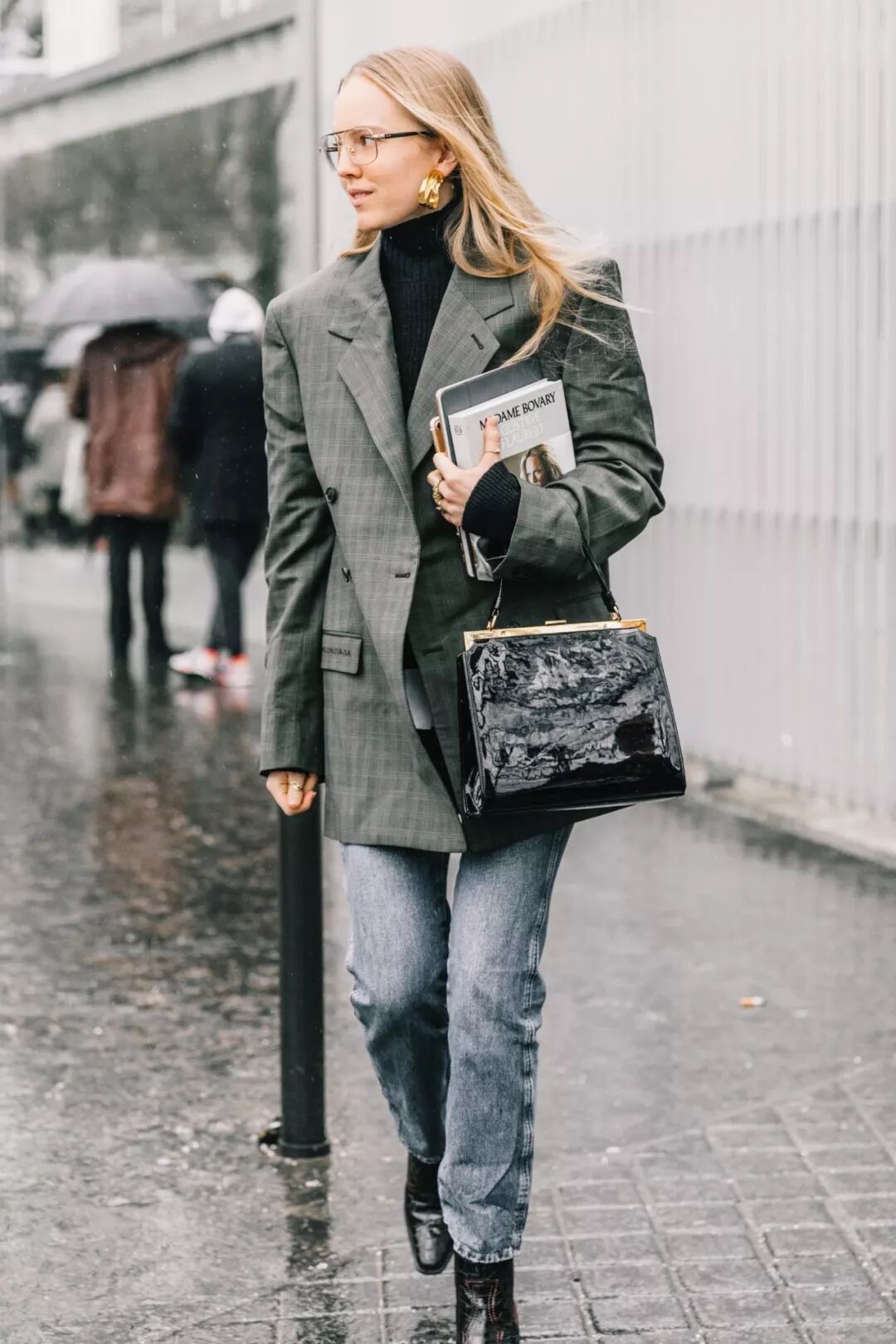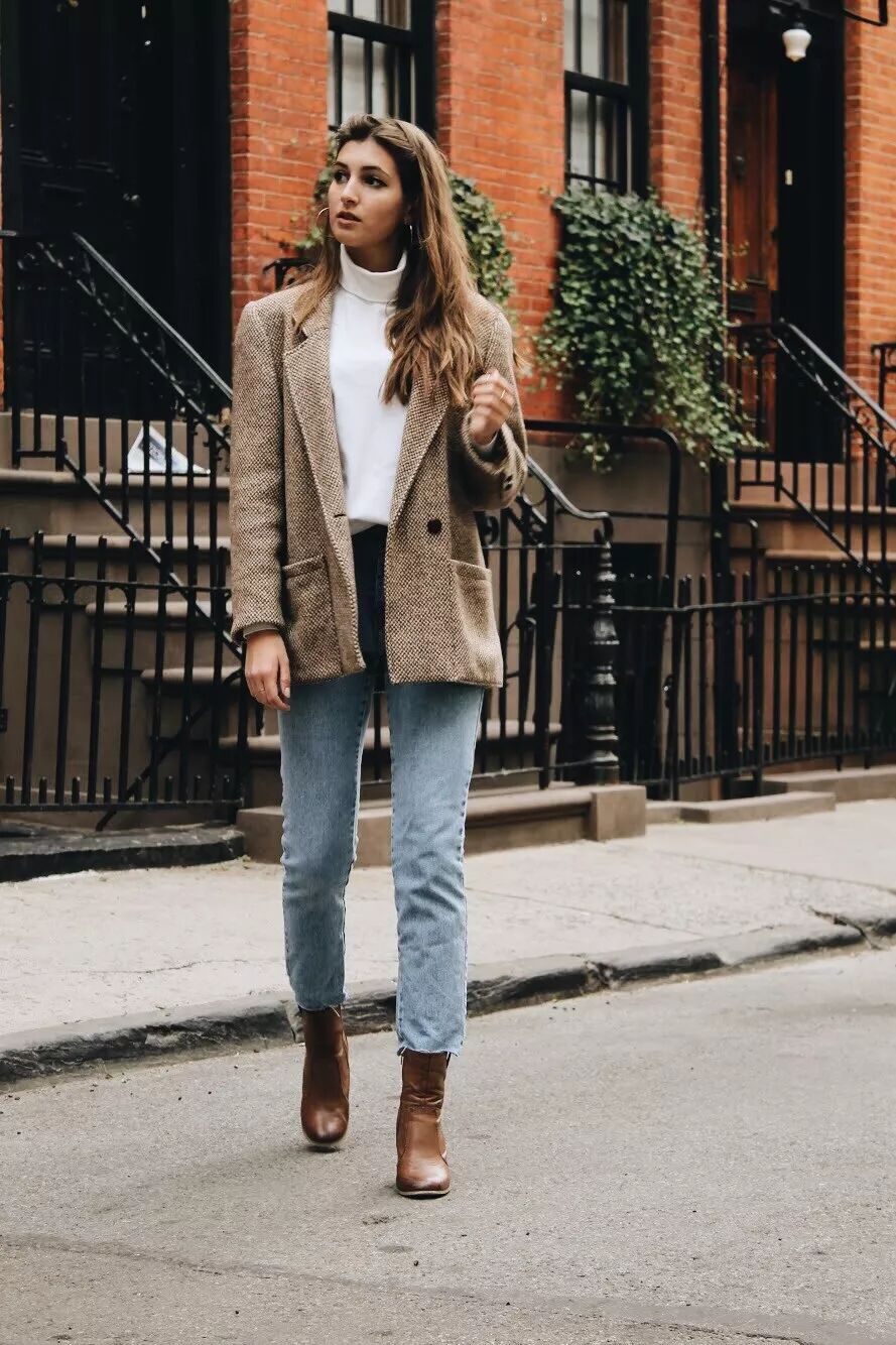 西服外套混搭牛仔褲會更具街頭潮范,內搭一件基礎色高領毛衣就非常chic了。