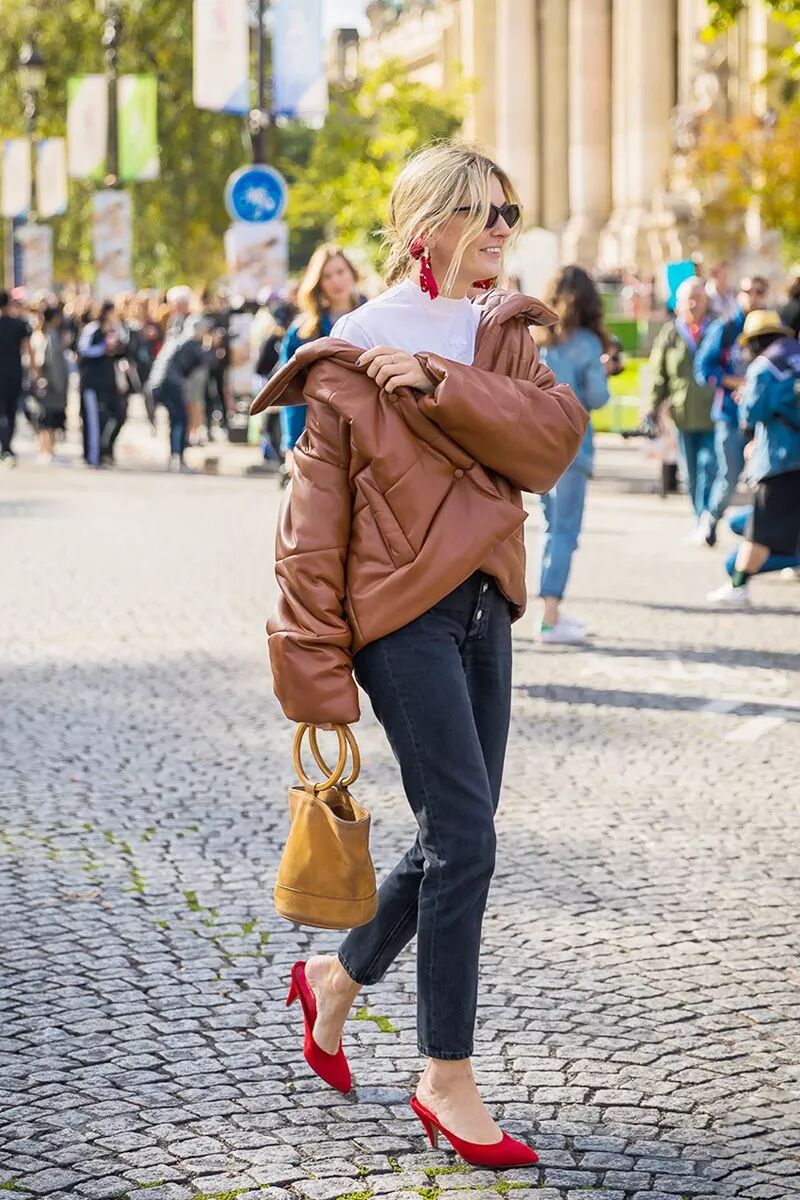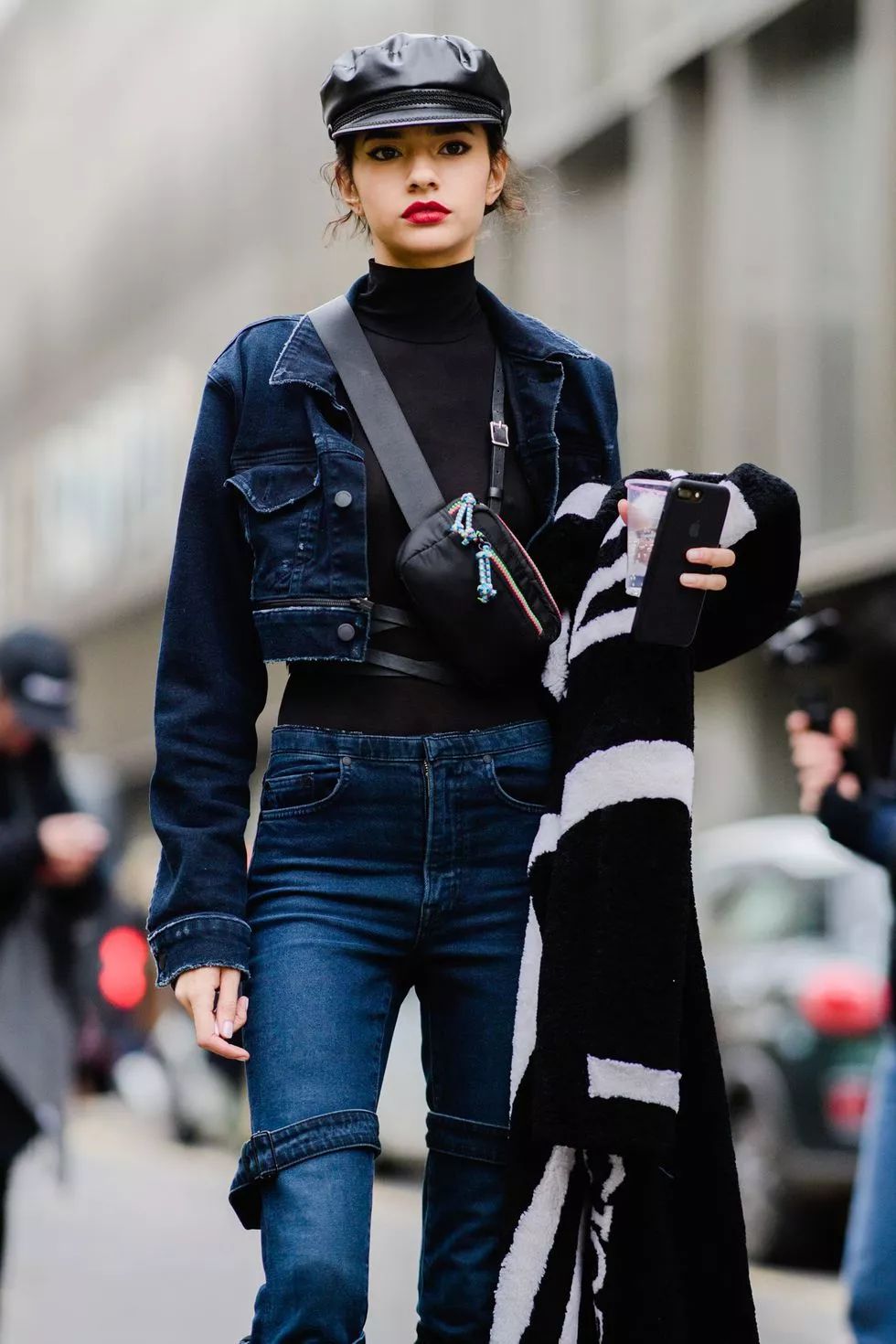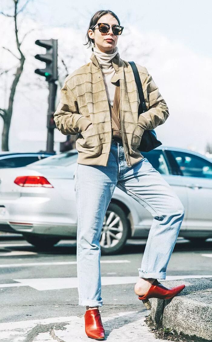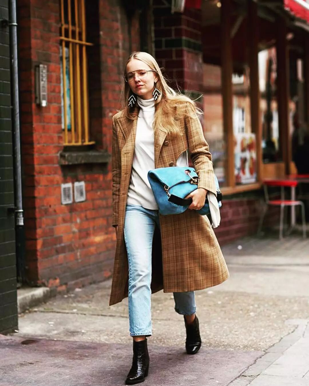 西服外套混搭牛仔褲會更具街頭潮范,內搭一件基礎色高領毛衣就非常chic了。