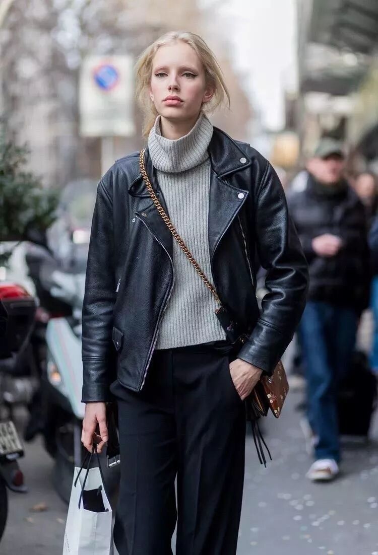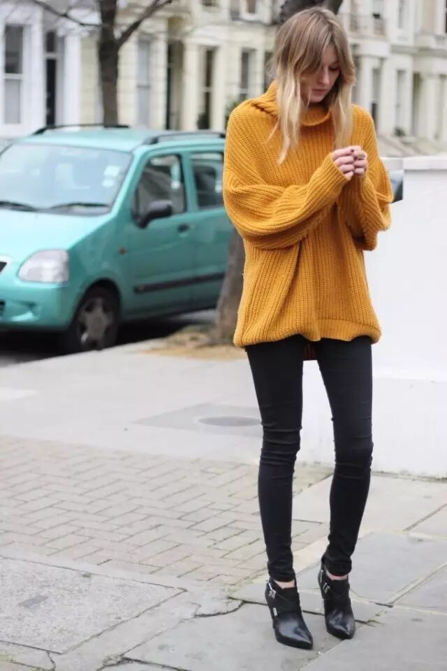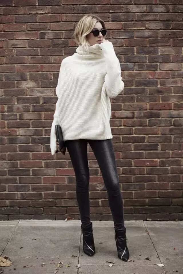 oversized的高領毛衣+緊身褲是秋冬季出鏡率最高的經典搭配套路之一,「上松下緊」顯瘦無敵,大寫的帥氣有型。