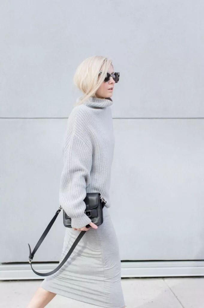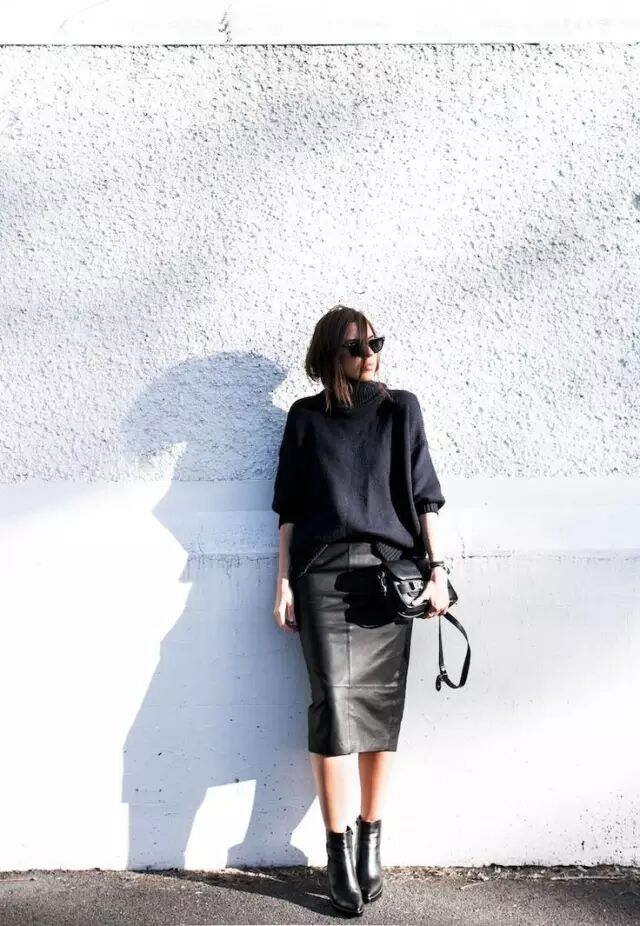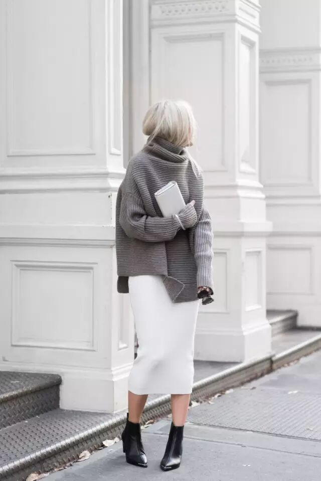 oversized高領毛衣+緊身包臀鉛筆裙的組合不僅實力顯瘦,還能勾勒出女性獨有的曲線美,無需刻意裸露就能性感爆棚。
