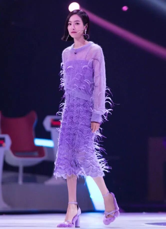 宋茜平時都是酷酷的打扮,這次她穿了紫色吊帶裙走淑女的風格,外面罩了一件同色半透明的紗衣,形成了一道亮麗的風景線,再看她穿的鞋,真的是會凹造型!