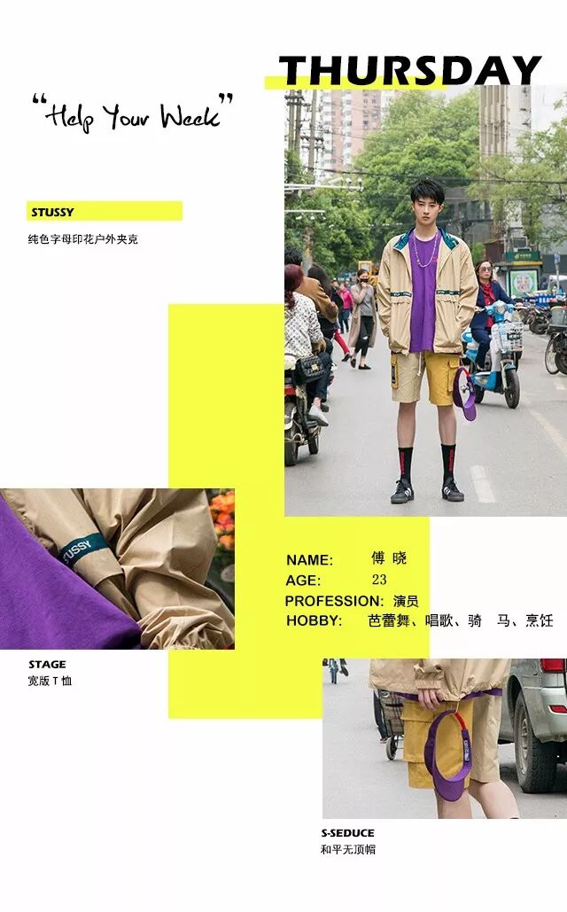雖然然男生的穿搭普遍都認為黑色、白色是最安全的搭配,可是到了春夏還是需要些色彩,作為名義上的流行色——紫色,男生選擇紫色還是在小面積上運用,內搭tee和小配件上,選擇卡其色與其對應。