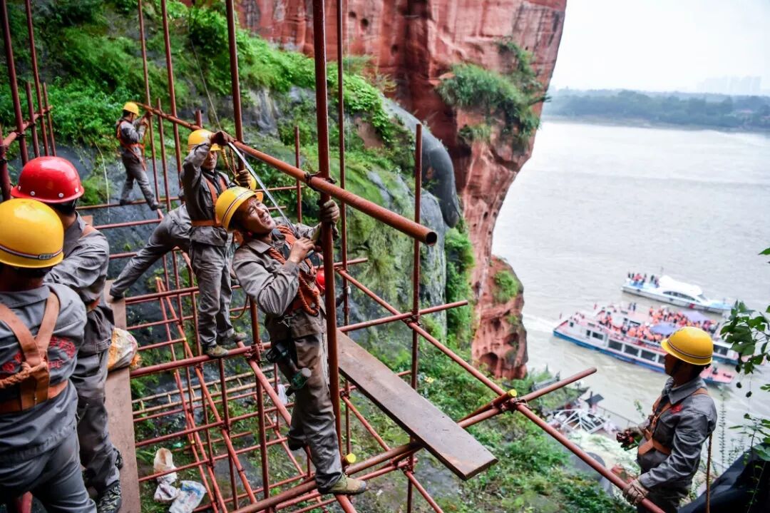 「你可能很難想像,工人們要搭建這麼大規模的腳手架,而它卻與大佛造像本體幾乎沒有直接的接觸。」孫博說,「我們在大佛左右手部分別搭建了橫跨手部的兩個型鋼承重平台,這兩個平台承重受力後把力直接傳導在地面和大佛兩腿之間的賦存巖體。所有可能接觸到大佛的鋼管兩端都包裹了防護柔性材料。」