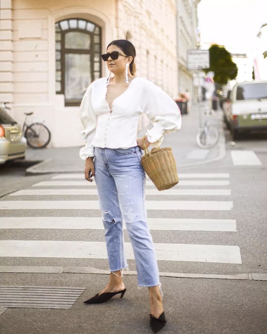 牛仔的面料還是比較硬挺的,選好適合自己腿型大小的牛仔直筒褲就和上半身偏胖最好選擇面料相對挺闊的棉質白襯衫是一個道理。越緊貼自己的皮膚,肉肉越容易暴露~