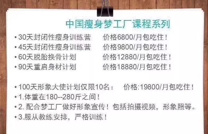 包吃住,定期組織體重PK比賽文藝演出並頒發獎品!