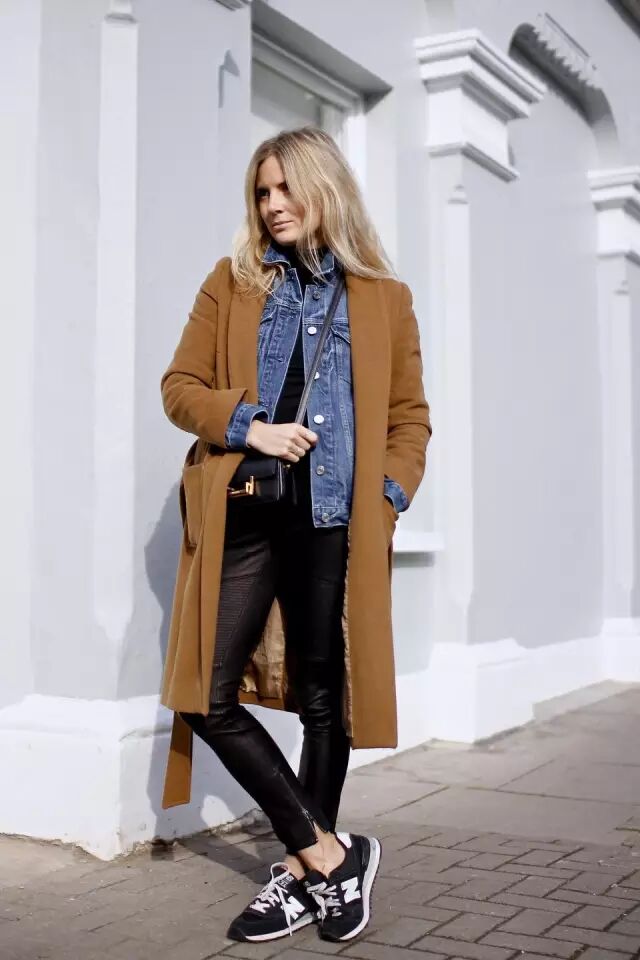 駝色大衣與牛仔外套疊穿,保暖與時髦都輕鬆翻倍。