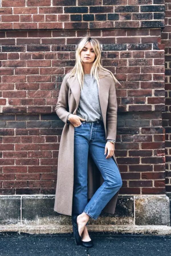 最常見的要屬駝色外套+牛仔褲的組合,上身簡單地搭配純色打底衫or條紋tee,就可以又chic又時髦。