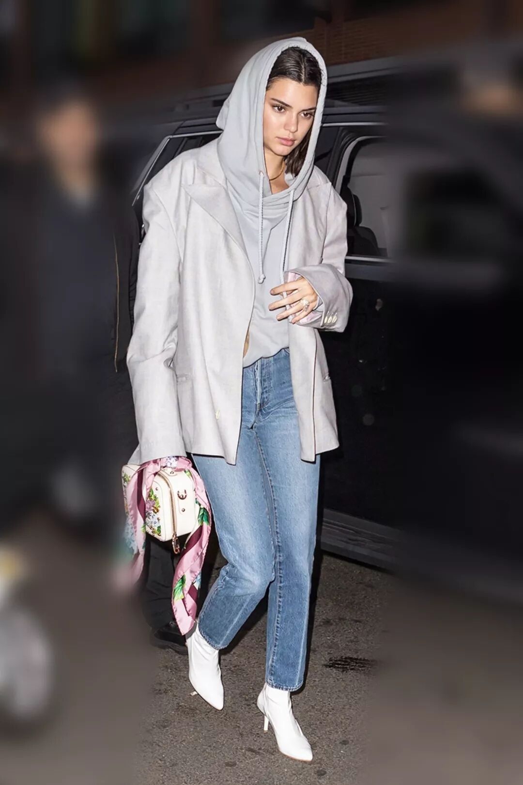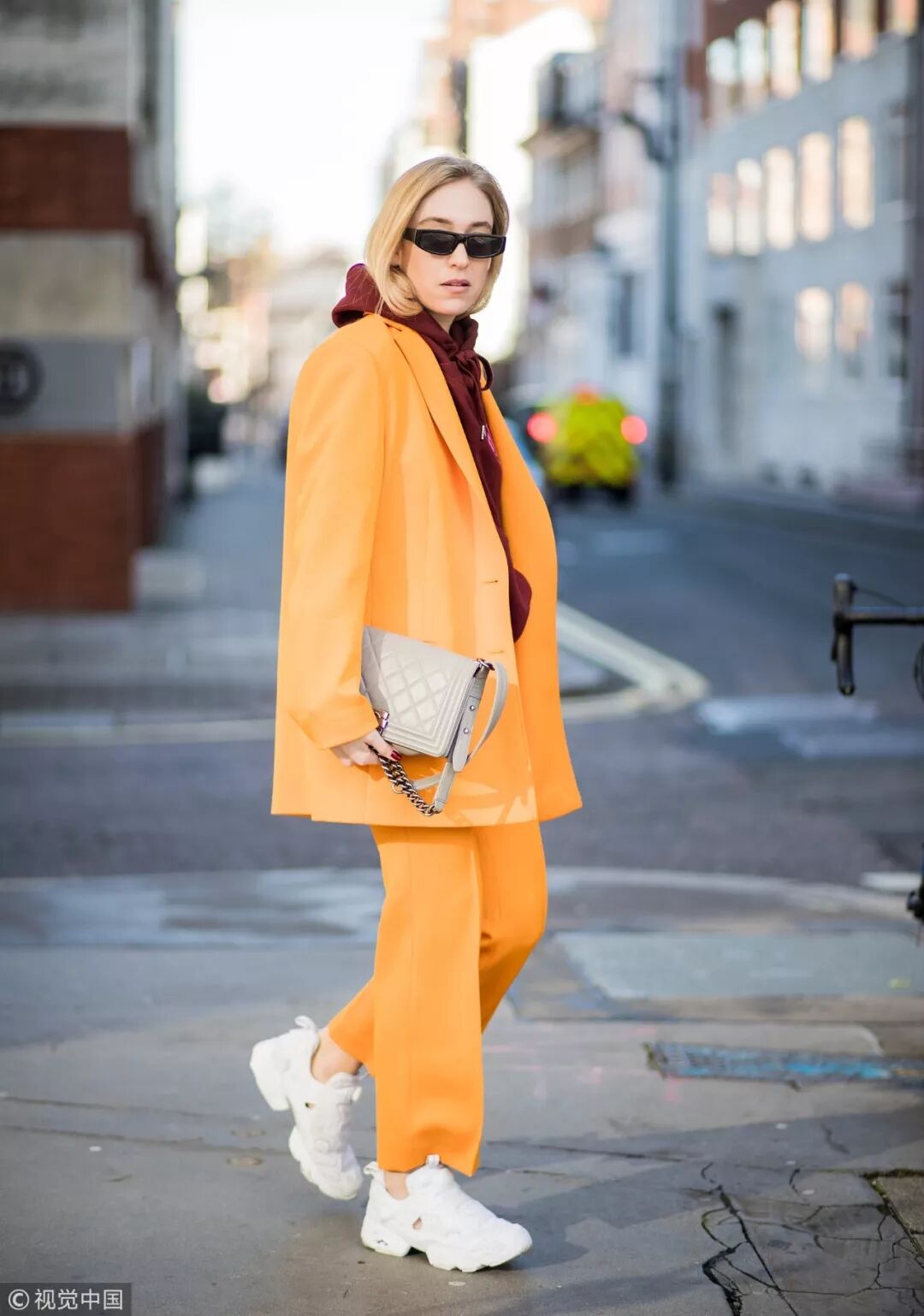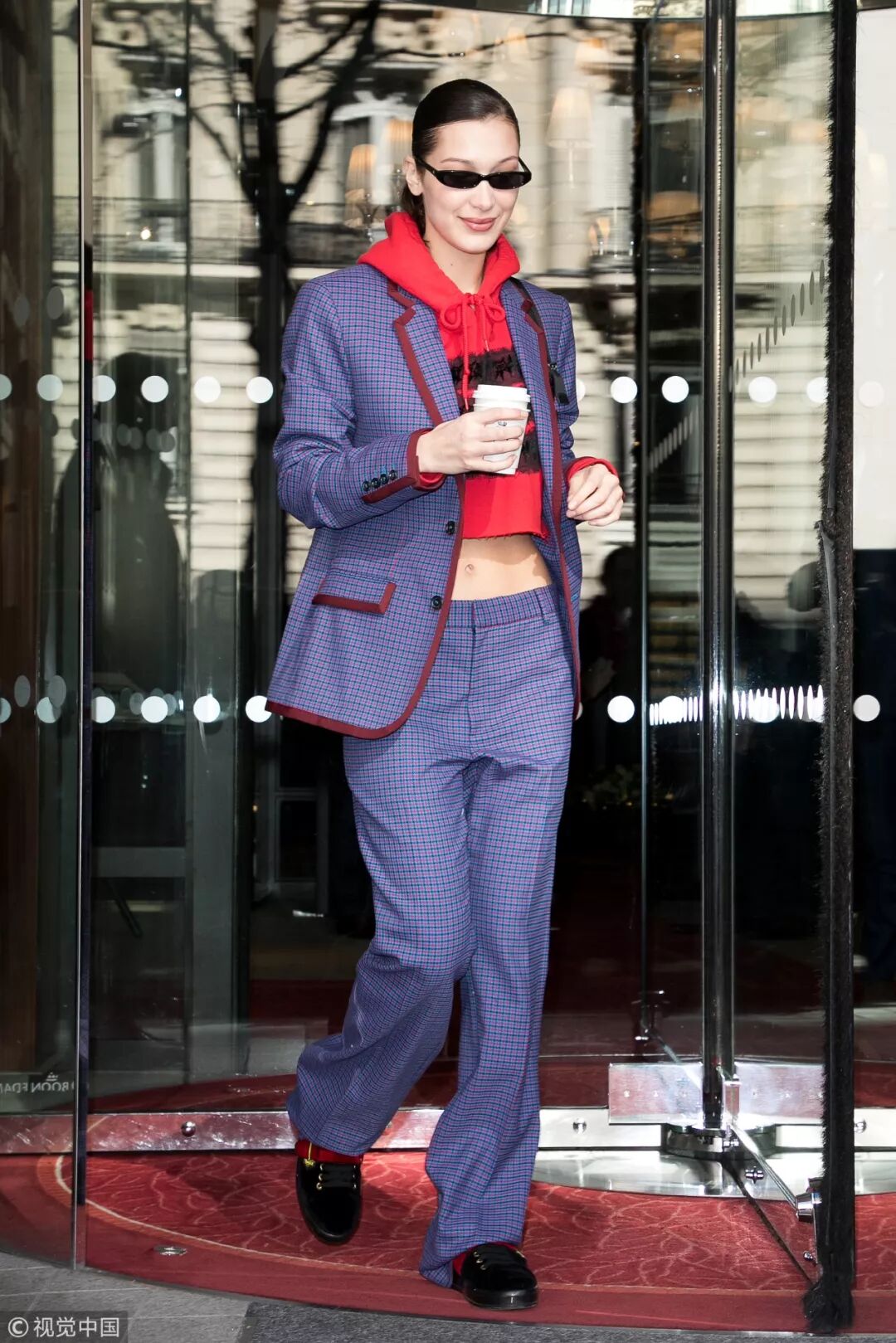 或者像Hailey Baldwin這樣選擇炫目色彩的套裝式LOOK,內搭帽衫採用其中一個呼應色,並以Crop-top設計成為最大亮點,同樣能讓人感受到西裝+帽衫的全新時髦感。