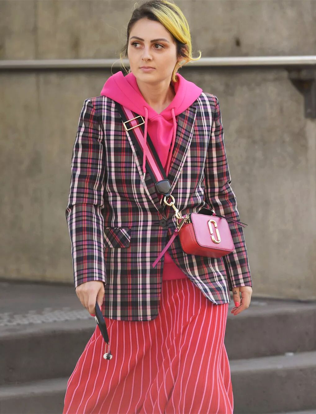 如果正好格紋和內搭的彩色帽衫有顏色呼應,那麼搭配效果會更加出色,和諧又吸睛。