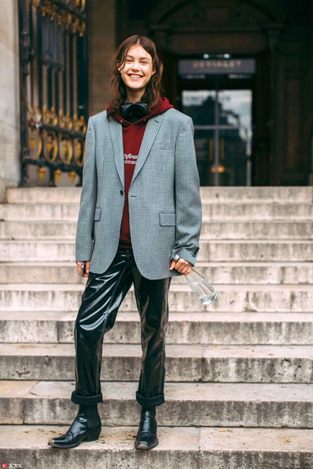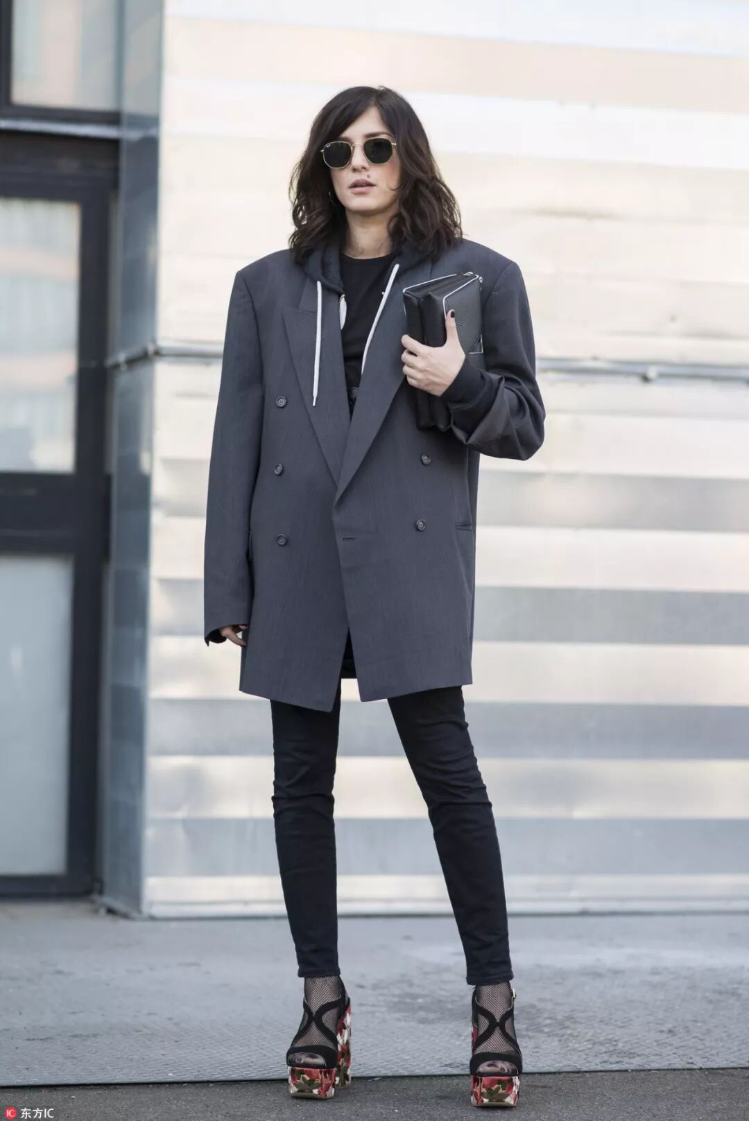 這里要闡述一下Oversize和寬肩的區別:前者的寬鬆設計遍布全身,包括肩部、袖圍和下擺等;而後者著重加寬肩部,所以Oversize西裝上身會顯得一絲「魁梧」,內搭需要很好的收斂效果,帽衫就可以做到。