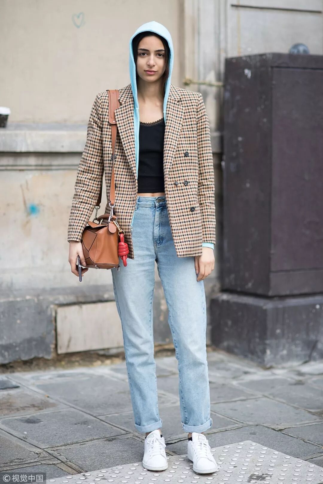 前面提到了復古風,自然不能遺忘格紋的存在。格紋西裝在今年也是大勢單品,不過自帶復古氣質的它難免會顯得太過成熟,此時你就需要學生氣的帽衫為你解圍了。