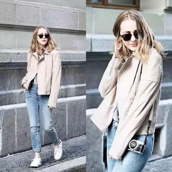 矮個子女孩不太適合穿超長款的外套,可以利用短外套分割腰線來讓自己視覺上達到大長腿。搭配牛仔褲,簡單的經典單品,混搭在一起,很時髦很有架式。簡約而不簡單的搭配.