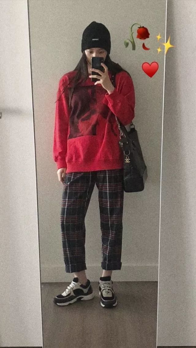 ▲ 紅色印花衛衣與格紋褲中的紅色互相呼應,可以發現娜娜在每天的穿搭照上都會放上「今日色系」。