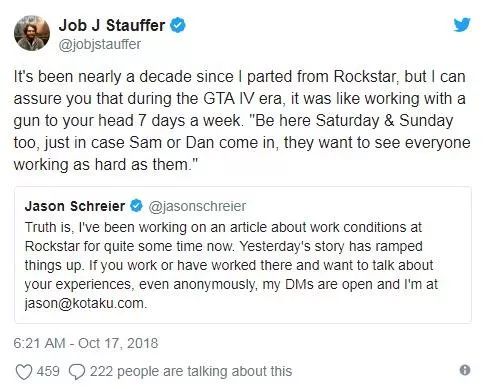 一名R星前員工Job J Stauffer在推特上發表了自己當年在公司加班的感受,他表示:「如今我已離開R星超過了10年,回想起當年開發《GTA 4》的感受,的確像是有人每周7天不停拿槍指著你的頭一樣;我們周六、周日也要來公司,還要防止老板們的突擊檢查,畢竟他們希望看到所有人都像自己一樣努力工作。」