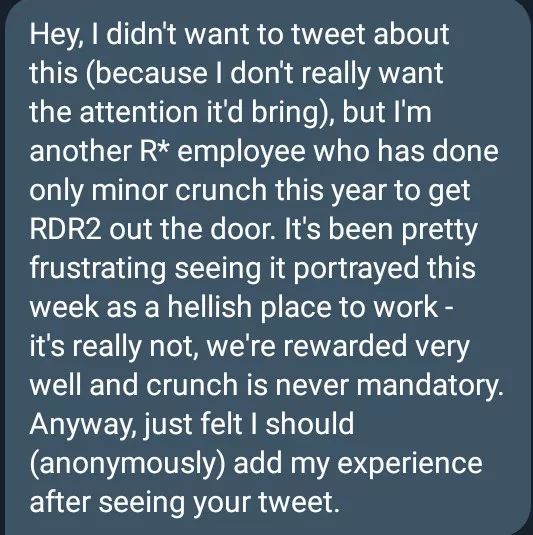 以上是西方媒體報導的三位R星員工對其公司的控訴,從中我們可以感覺到長時間的體力勞力確實對他們的生活造成了一定的影響,以上言論也是R星當時處在輿論風口——媒體對其壓榨員工一事的口誅筆伐中最常見的控訴。