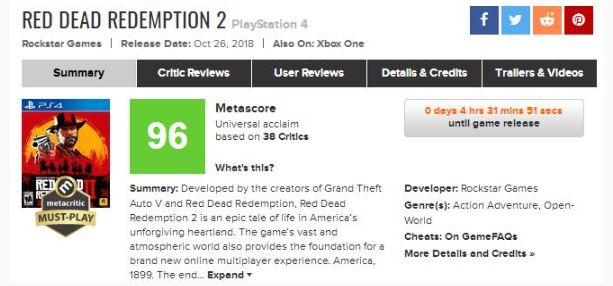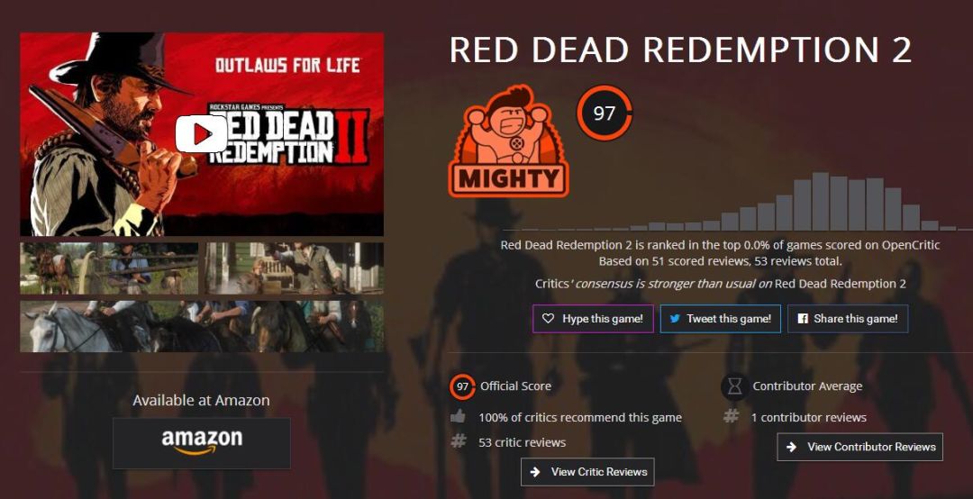 被廣泛關注的《荒野大鏢客2》正式發布之後,媒體均毫不吝嗇的對其給予了好評。Metacritic和Opencritic是專門收集對於電影、電視節目、音樂專輯、遊戲等評論的網站,它總共收集了45個媒體對於《荒野大鏢客2》的評價,其中平均分達到了96分。媒體EGM甚至在評價中說:「《荒野大鏢客2》是有史以來最精美,最值得推敲的遊戲之一,如果你不去玩這款遊戲,要麼你不是一個玩家,要麼你就是處於昏迷狀態。」而Opencritic收錄的64個評測,平均分也同樣高達97分,且目前被「強制加班」事件折磨到低迷的股價也迎來了轉機;在《荒野大鏢客2》炸裂口碑的帶動下,R星母公司Take Two第二季度股價迎來了快速上漲,不斷向歷史最高點逼近。
