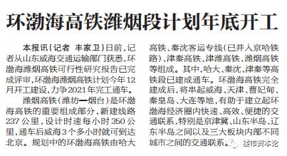 此外,據北京日報消息,環渤海高鐵已計劃年底前開工,並於2021年前階段性完工通車。