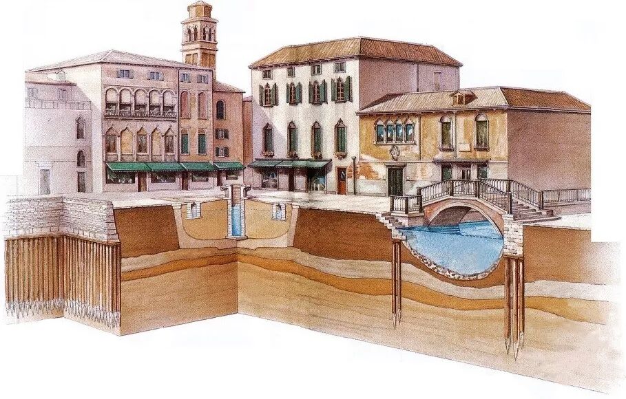 威尼斯建於威尼塔潟湖內的灘塗之上,整個城市的建築均紮根於水下,有著150多條水道與400多座橋梁,城內沒有車輛,僅以舟船相通。