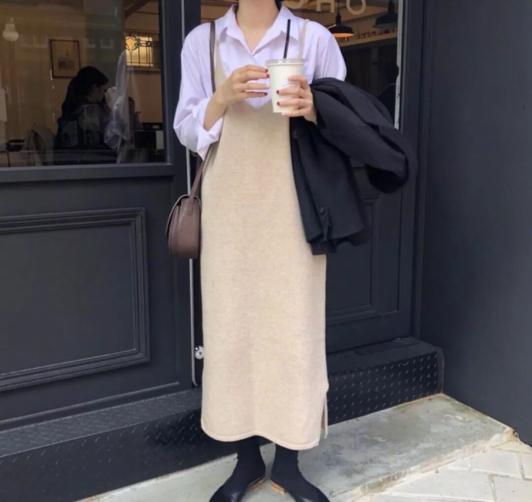 白襯衫搭吊帶毛衣裙也是很有風格味道的選擇