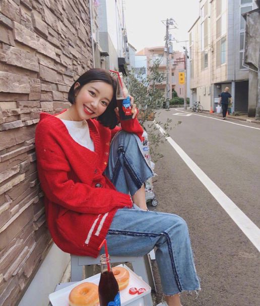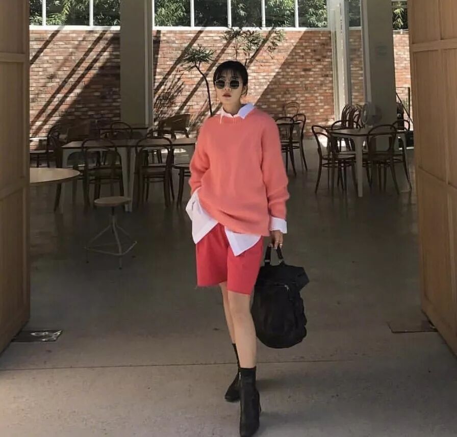 高飽和度的西瓜紅毛衣疊搭白襯衫
