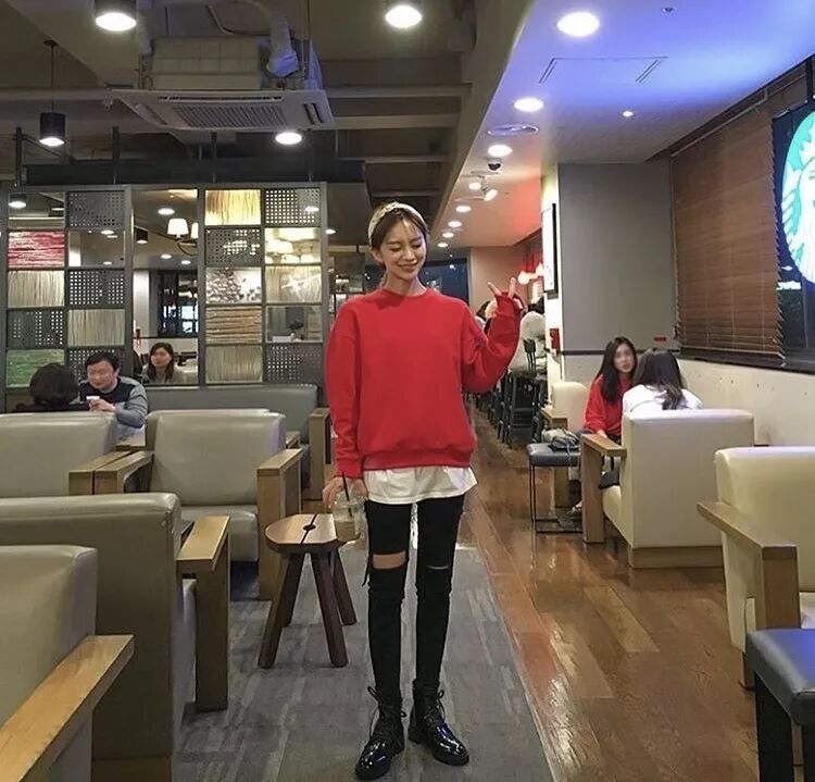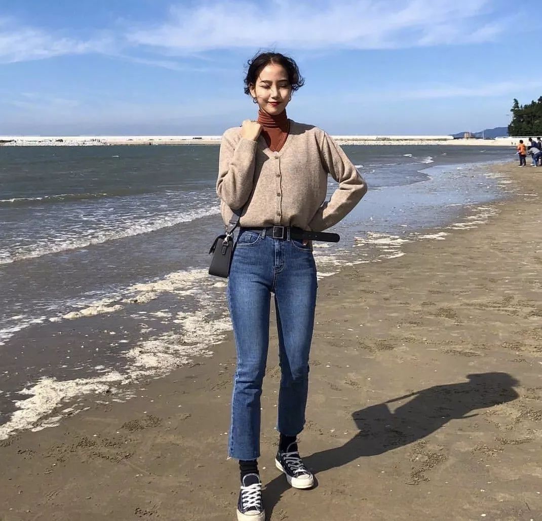 毛衣上身疊穿 T恤、襯衫、打底衫,下裝搭配修身牛仔褲,穿搭風格是偏休閒隨性感覺的~
