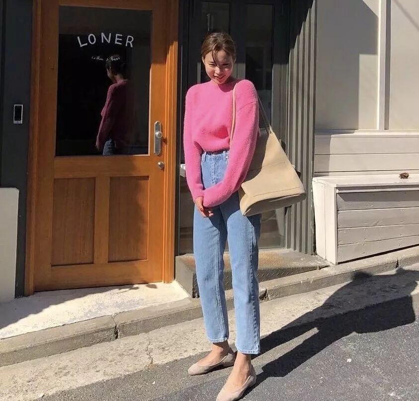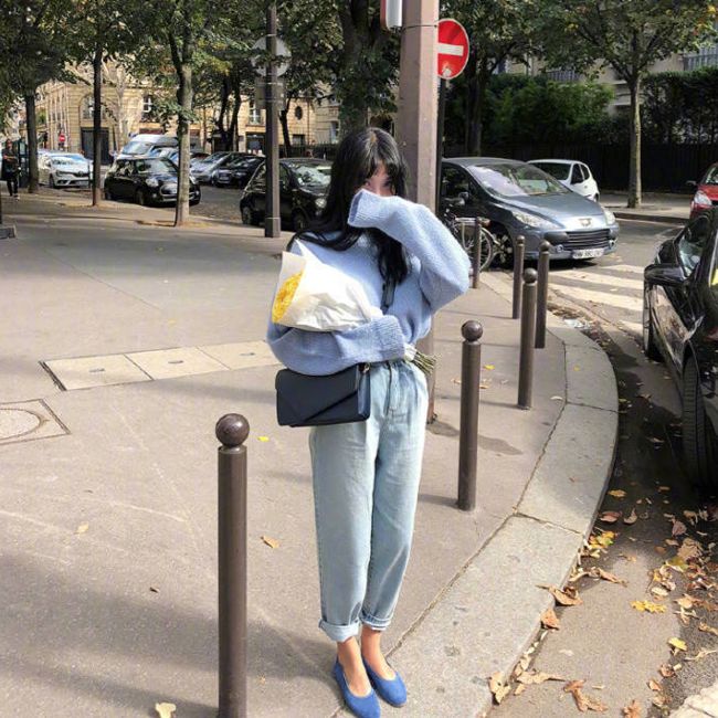 淺藍色系的毛衣搭配淺色媽媽型牛仔褲