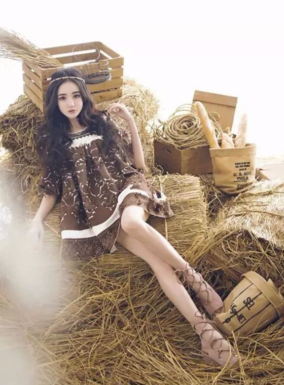劉雨欣身穿棕色連身小短裙復古文藝,蓬蓬袖的可愛設計洋溢著少女夢幻浪漫的感覺。淡棕色色綁帶皮鞋的搭配展現出雪白迷人的腿部線條,使得整體造型更加完整。