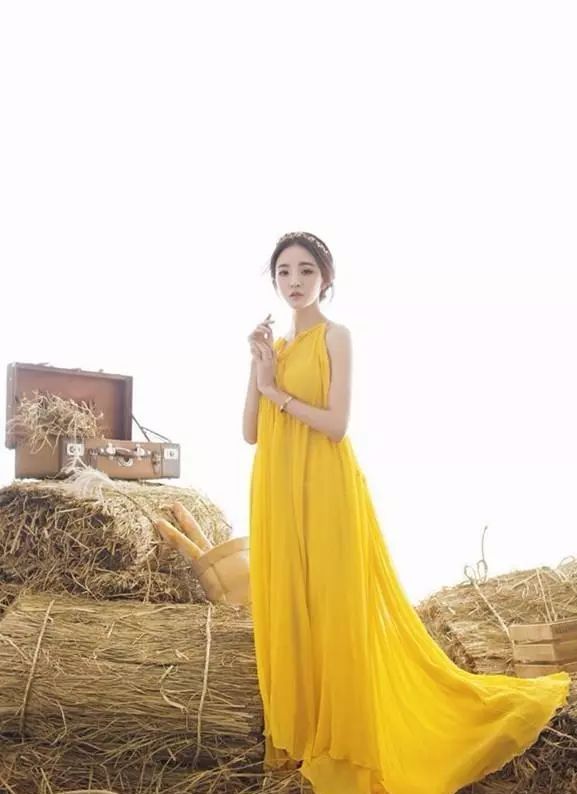 劉雨欣穿黃色削肩絲綢大長裙亮麗大氣,柔滑的觸感與搶眼的色彩展現出肌膚的雪白,超大裙擺的設計仙氣十足,搭配挽起的發髻和素淨的臉龐,盡顯女神風範。