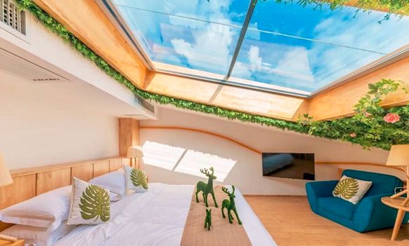 白天待在房間里,宛如置身田野,隔著透明氣泡,身邊花草仿佛觸手可及;夜晚躺在床上,抬頭便是繁星點點,我鑽進泡泡里,想要飛到你身邊。