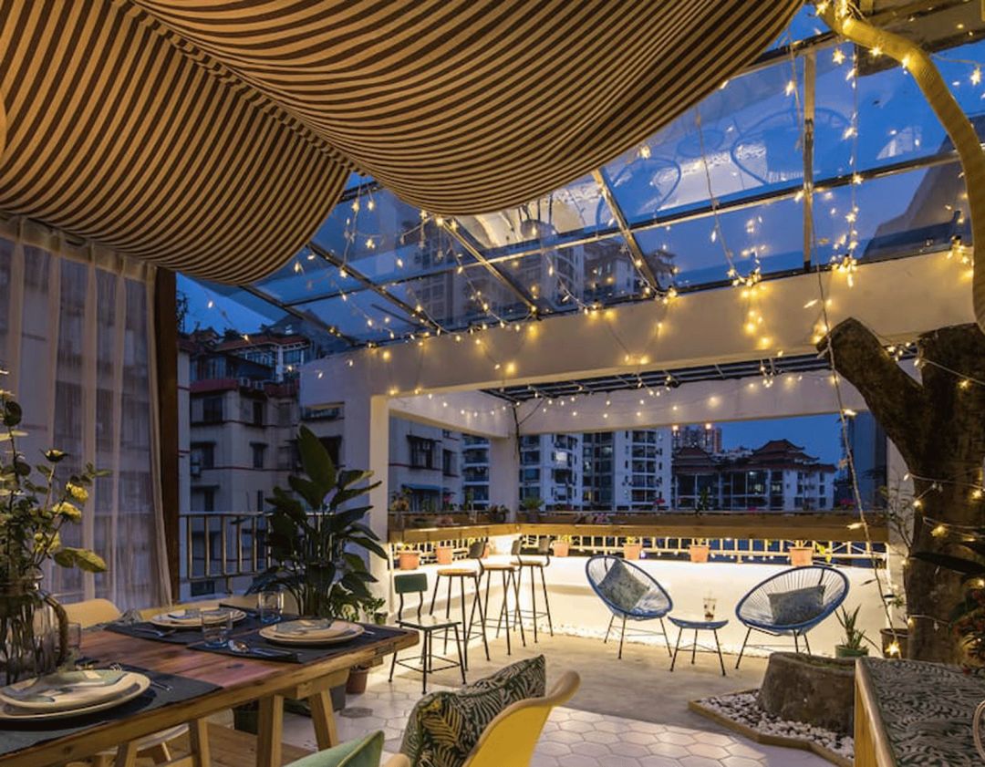 房子採用暖色調與木材為主要元素,感受著有溫度的生活格調。一個被紗簾環繞的半戶外餐吧,當天色漸暗,華燈初上,漫天閃爍的燈光烘托了天台的浪漫情調。