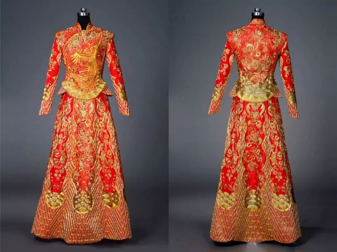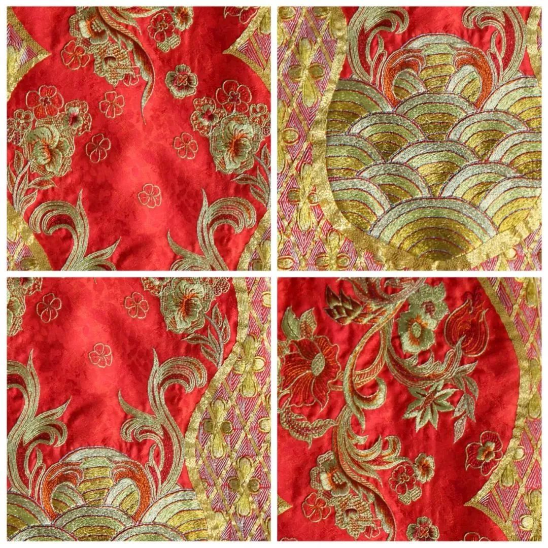 刺繡部分採用金繡與盤金繡,其中金繡工藝由郭培及其團隊研發。與將金箔捻成的金線盤在織品上的盤金繡不同,金繡將更細的金線穿梭於織物之中,呈現更加豐富細膩的圖案。但這種金線容易折斷,此套囍服共耗費4506工時才得以完成