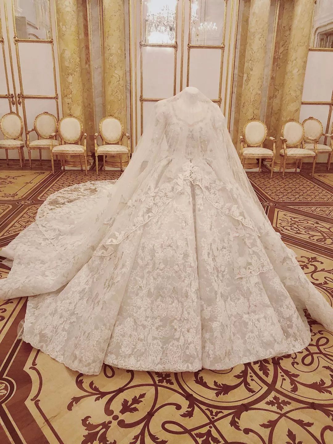 你知道這麼華麗又細致的婚紗要花多久來做麼?5600小時!婚紗全身都是水晶和釘珠,還有1206朵手工做的蕾絲玫瑰花,它們枝葉相連,意思是相親相愛。