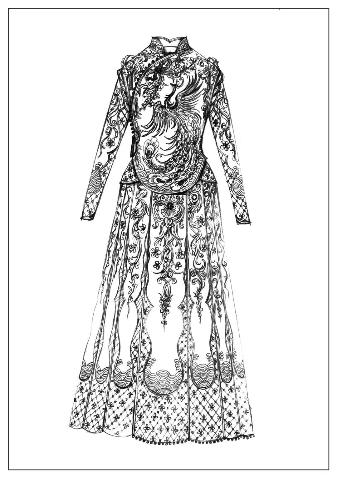 上衣部分將晚清經典的坎肩形制改良,腰部兩側的設計,從中國古建築中的飛簷翹角中汲取靈感郭培在傳統中式圖案基礎上,加入蝴蝶結等浪漫的法式元素,包括來自19世紀的歐洲古典紋樣