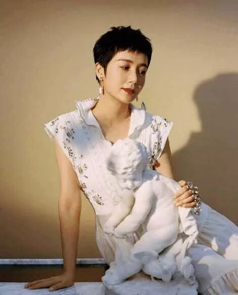 只見身穿白色的連衣裙,精致的妝容,耳環與身上的衣服都體現出了高貴的感覺,懷里抱著的漢白玉雕像也是與整個人的氣質很像,乾淨純粹靈動;