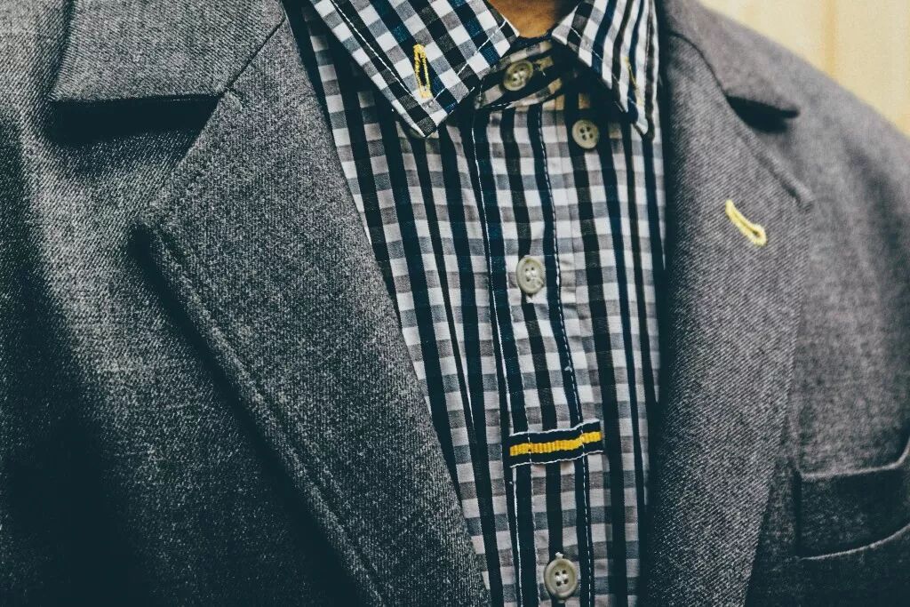 休閒格紋襯衫外面是略沉穩的灰色牛仔外套,部分縫線處還混入亮眼黃色,代表 CHECK inn 充滿活力的企業色,下身隨意搭配一條藍色牛仔褲,整體造型就很完美,工作起來心情該特別好吧~