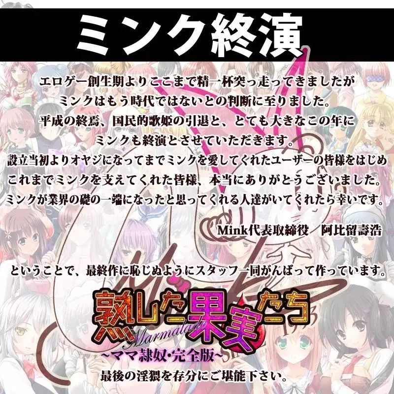 在宣傳旗下最新 H-Game 的同時,Mink 社長阿比留壽浩亦宣布公司關門