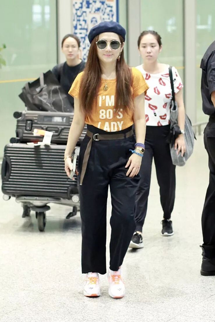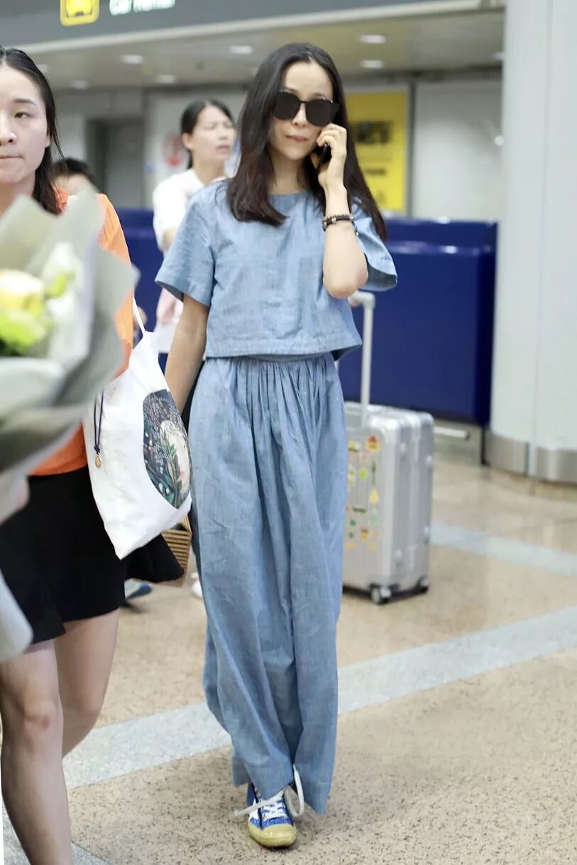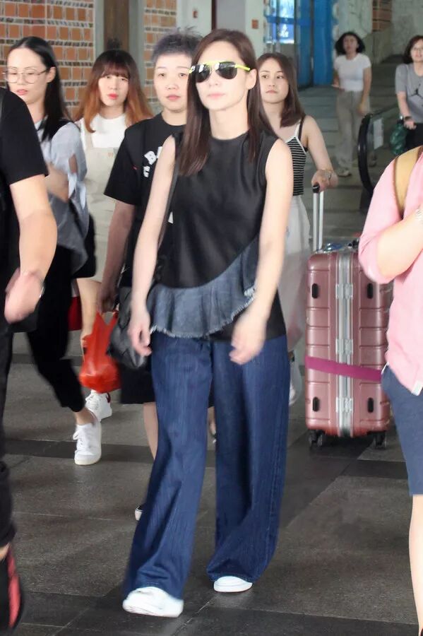 江一燕的闊腿褲搭配了應該是套裝的同色系上衣,不過這條闊腿褲的寬鬆沒腰線搭配了同樣寬鬆的短上衣,就真的沒有了腰線~