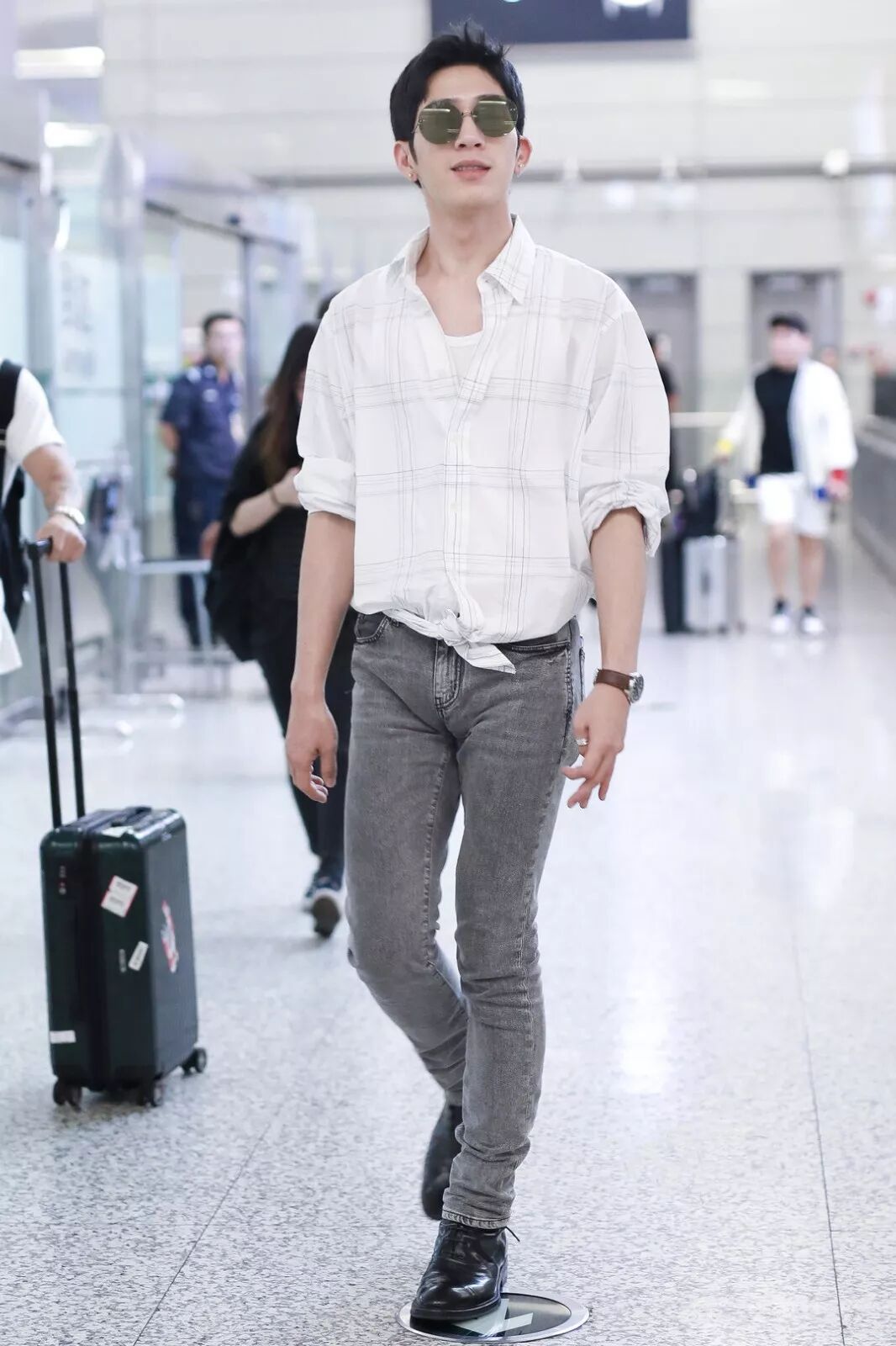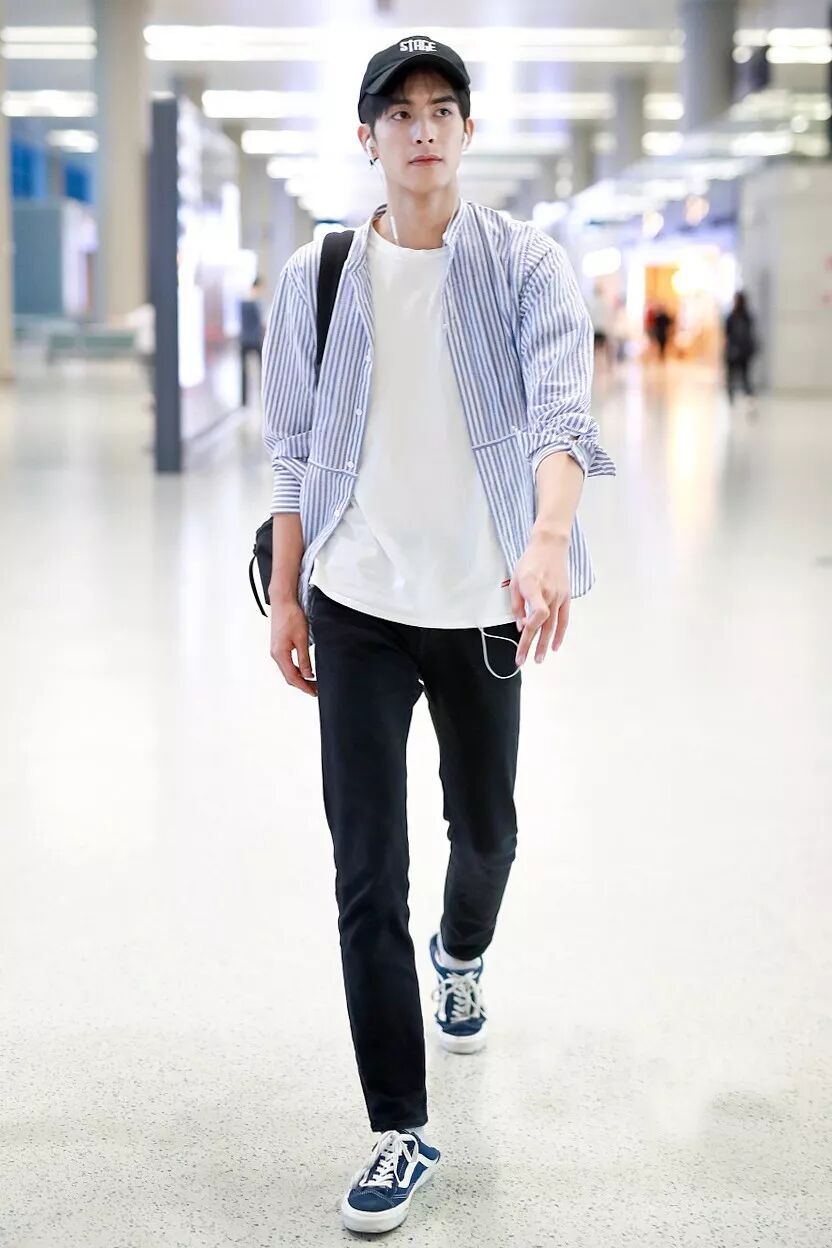宋威龍的純白T疊搭條紋襯衫,小黑褲,隨意的腳踩VANS,吹爆這顏。