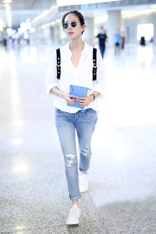 相比之下,張鈞甯的白襯衫版型沒有那麼大,修身略帶寬鬆度,塞進牛仔褲內搭配小白鞋經典的easy chic穿搭。