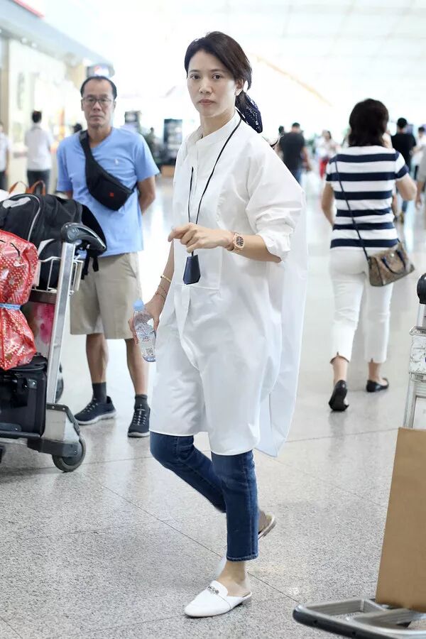 還有袁詠儀的oversize超寬鬆白襯衫+牛仔褲,搭配平底穆勒鞋,舒適出街。