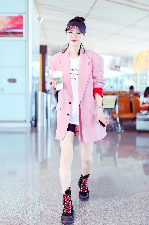 譚維維的一身pink西裝外套內搭字母T+單車褲,這身沒點氣場不好駕馭哦。