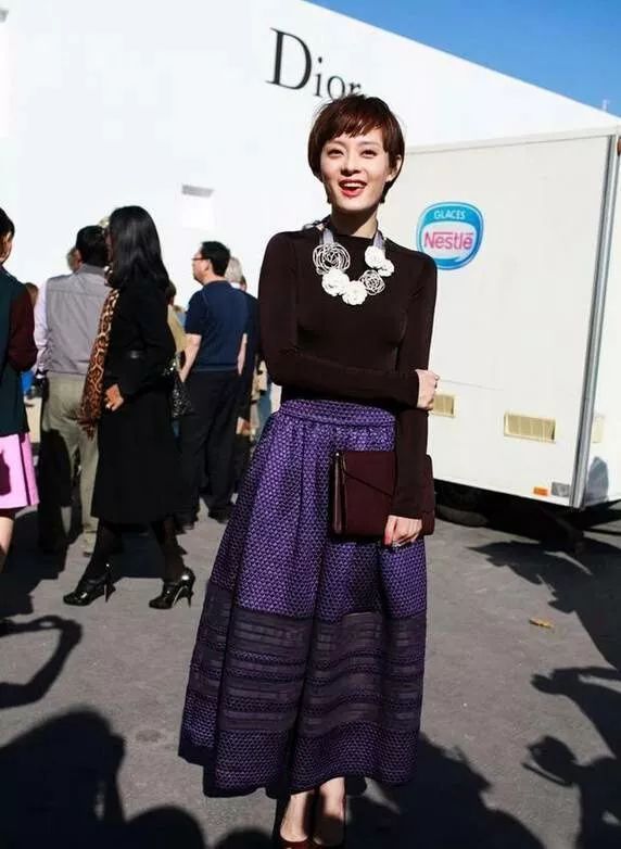 黑色的高領的衣服特別的有個性,搭配的是一條紫色的長裙看著非常的優雅了,黑色的高跟鞋和整體特別的搭配,突顯氣質
